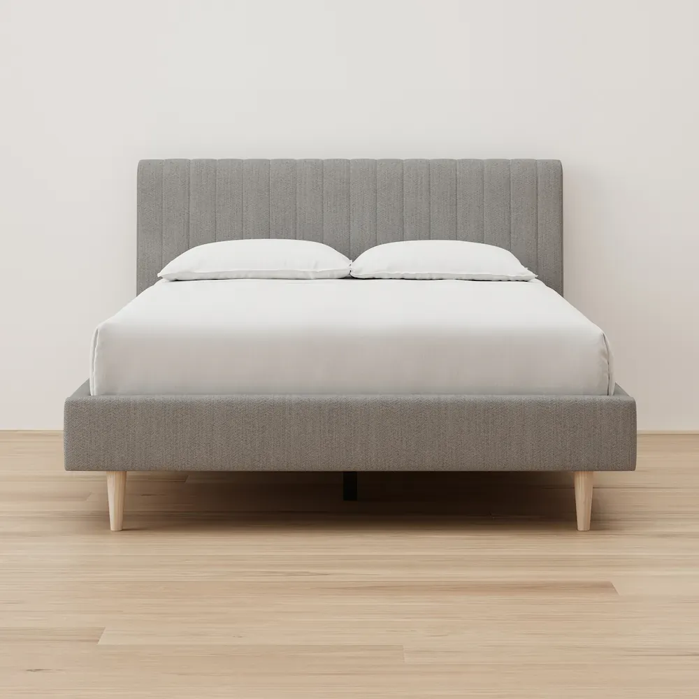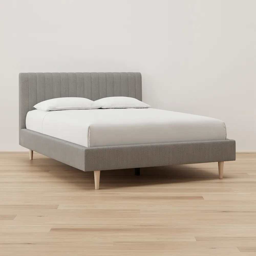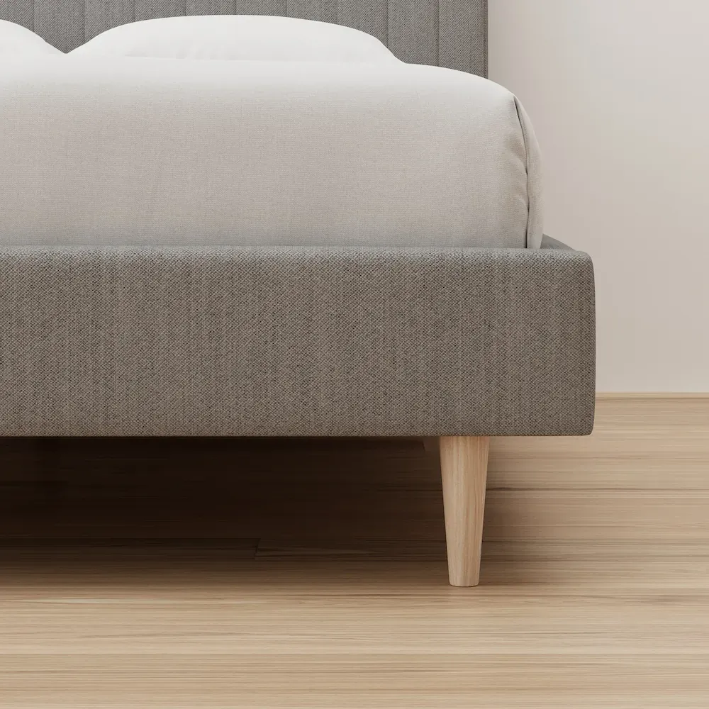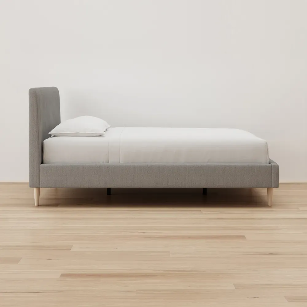 Upgrade your bedroom with The Claremont Bed Frame, which features a plush padded headboard, sleek midcentury style, and soft upholstery — no box spring needed.