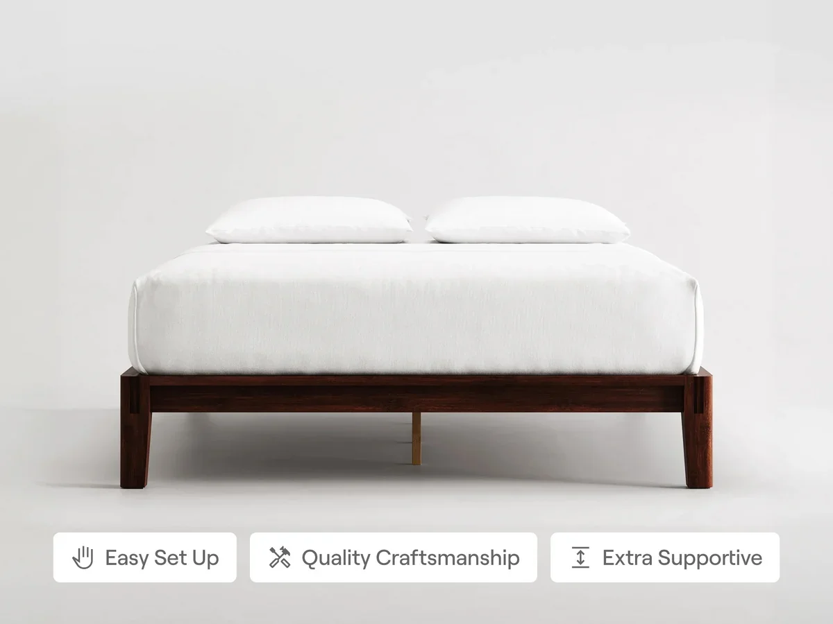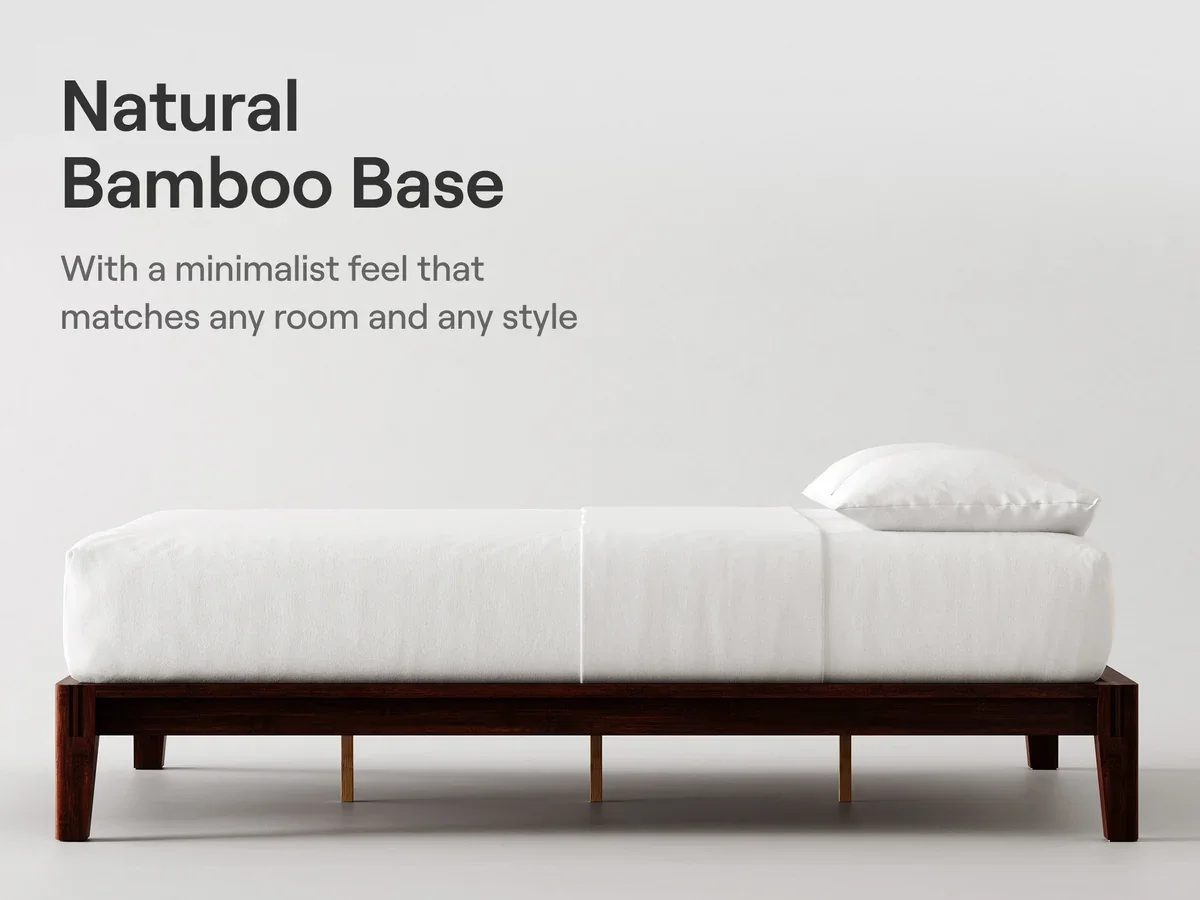 Made from sturdy bamboo with a clean, modern look, this frame offers lasting comfort with tool-free assembly and traditional joinery. Easy set up, built to last, no box spring needed.