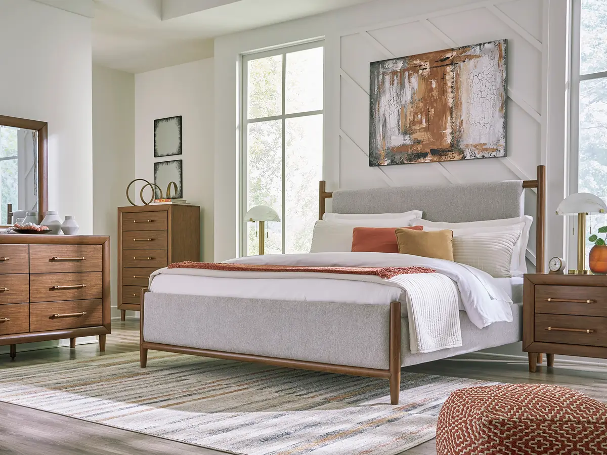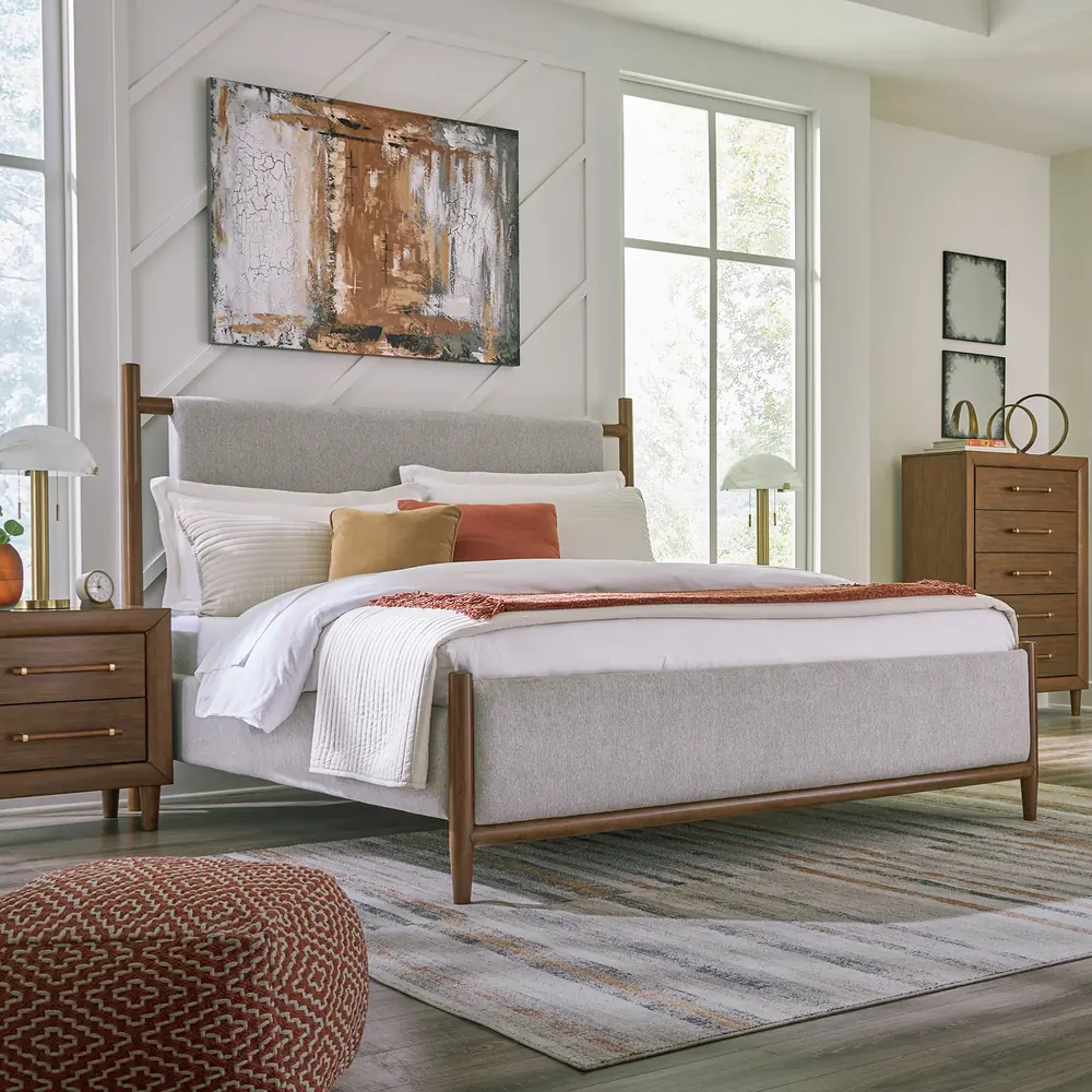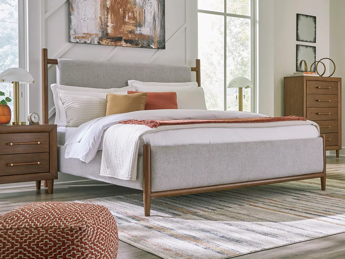 The Lyncott Upholstered Bed Frame combines sturdy wooden legs with soft upholstery to create a sleep space that’s both stylish and comfortable. Complete your dream space with the full Lyncott collection.