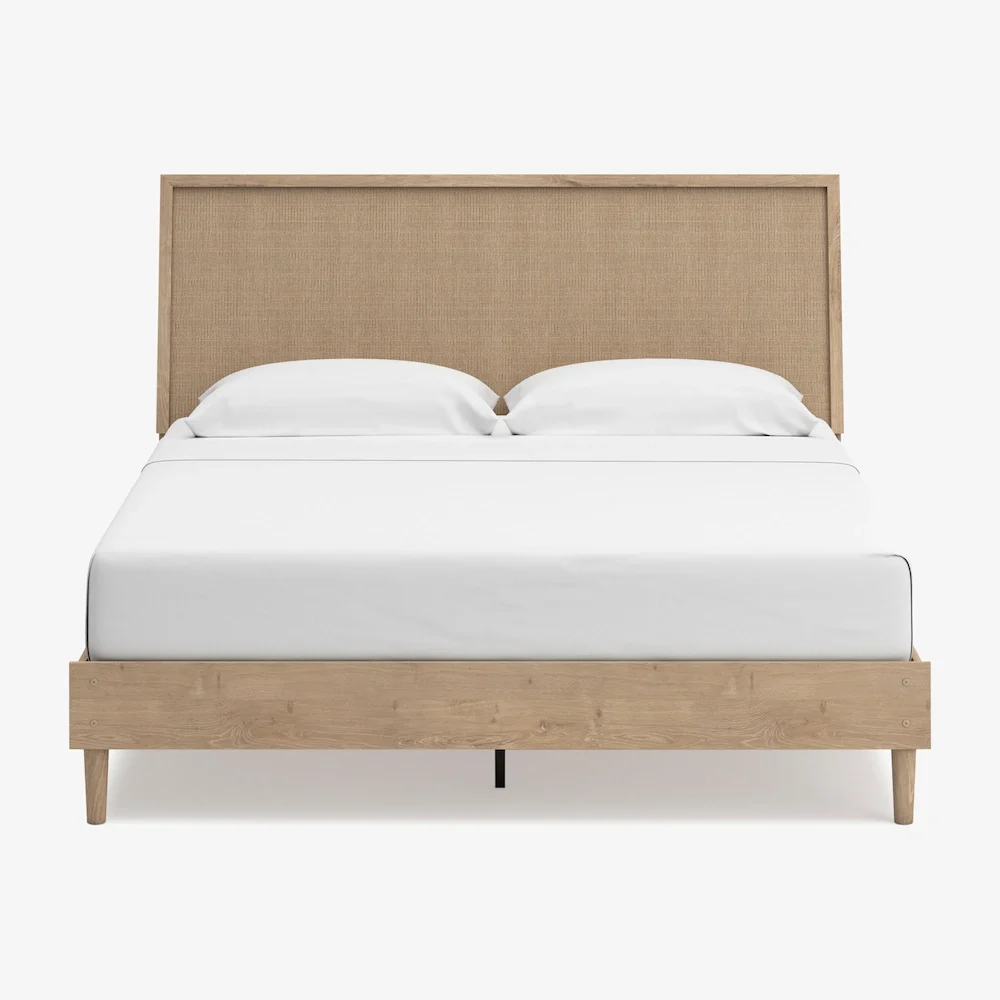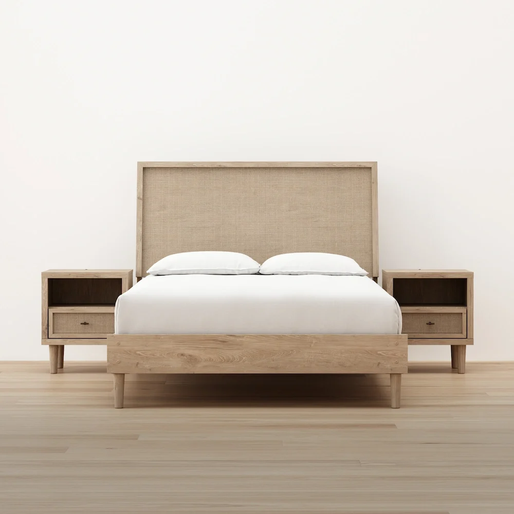 Elevate your room with the Mira Panel Bed Frame, which perfectly blends modern and boho design with a light oak grain finish and textured cane details. Add matching nightstands for a full set.