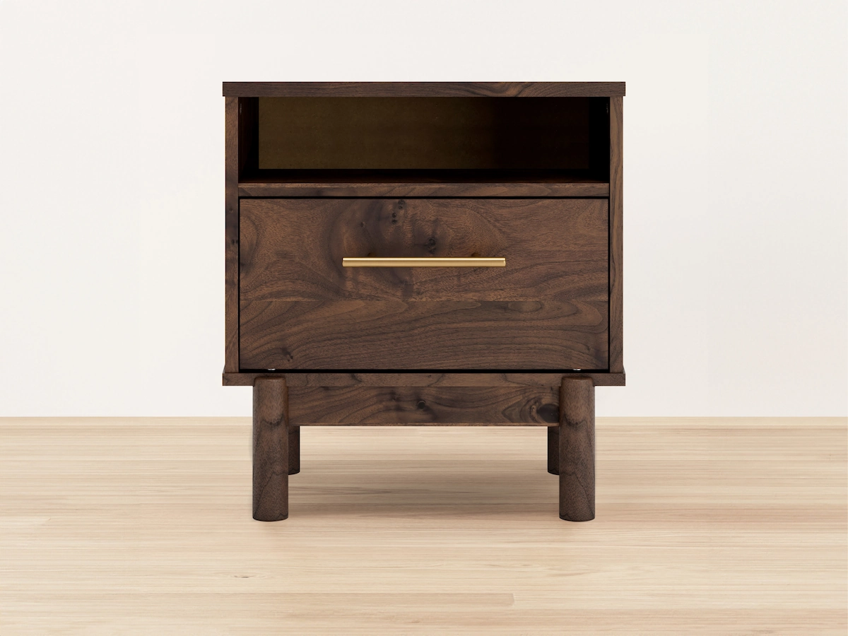 The Calverson Nightstand features a rich walnut finish, brass tone hardware, and easy storage. It’s the ultimate combination of modern style and practical functionality.