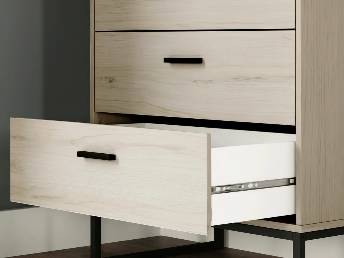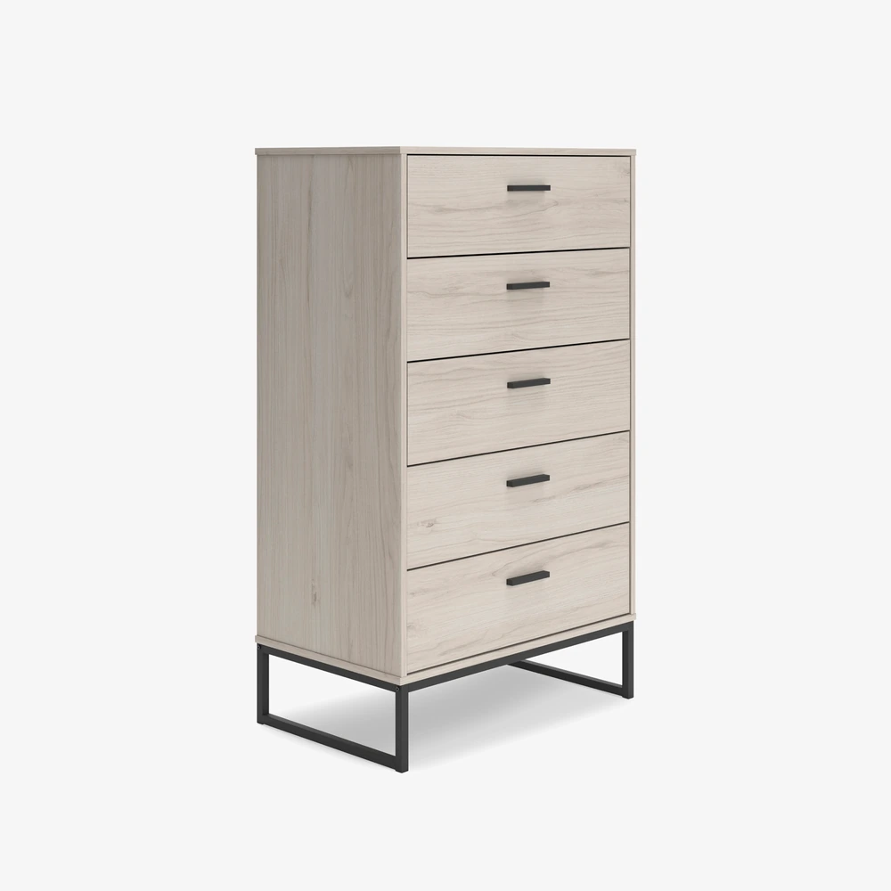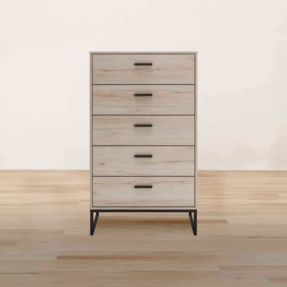 Bring a modern touch to your bedroom with the Socalle Chest, which has an oak-grain finish, five smooth-gliding drawers, and dark pewter-tone accents.