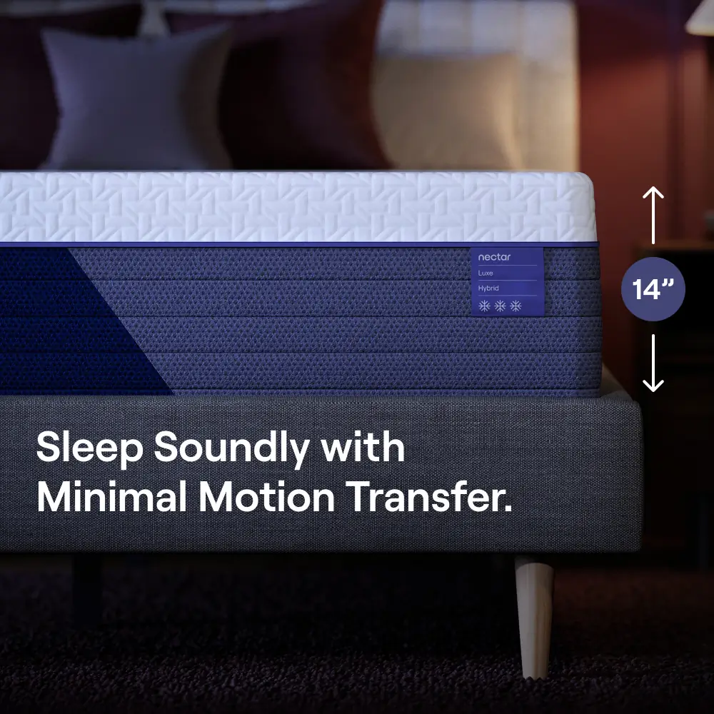 We’d call the Nectar Luxe Hybrid medium-soft, emphasizing contouring and cradling while still offering some pushback. Medium-soft mattresses are most recommended for side sleepers. Learn more about firmness